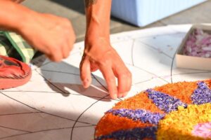 Tutti gli abitanti del borgo sono impegnati nella creazione di vere e proprie opere d’arte, dei quadri su strada realizzati interamente con petali e altri materiali vegetali naturali. La maestria degli “infioratori” locali è ammirevole così come la loro pazienza e il fatto di realizzare queste grandi opere effimere requesto l’evento unico nel suo genere.